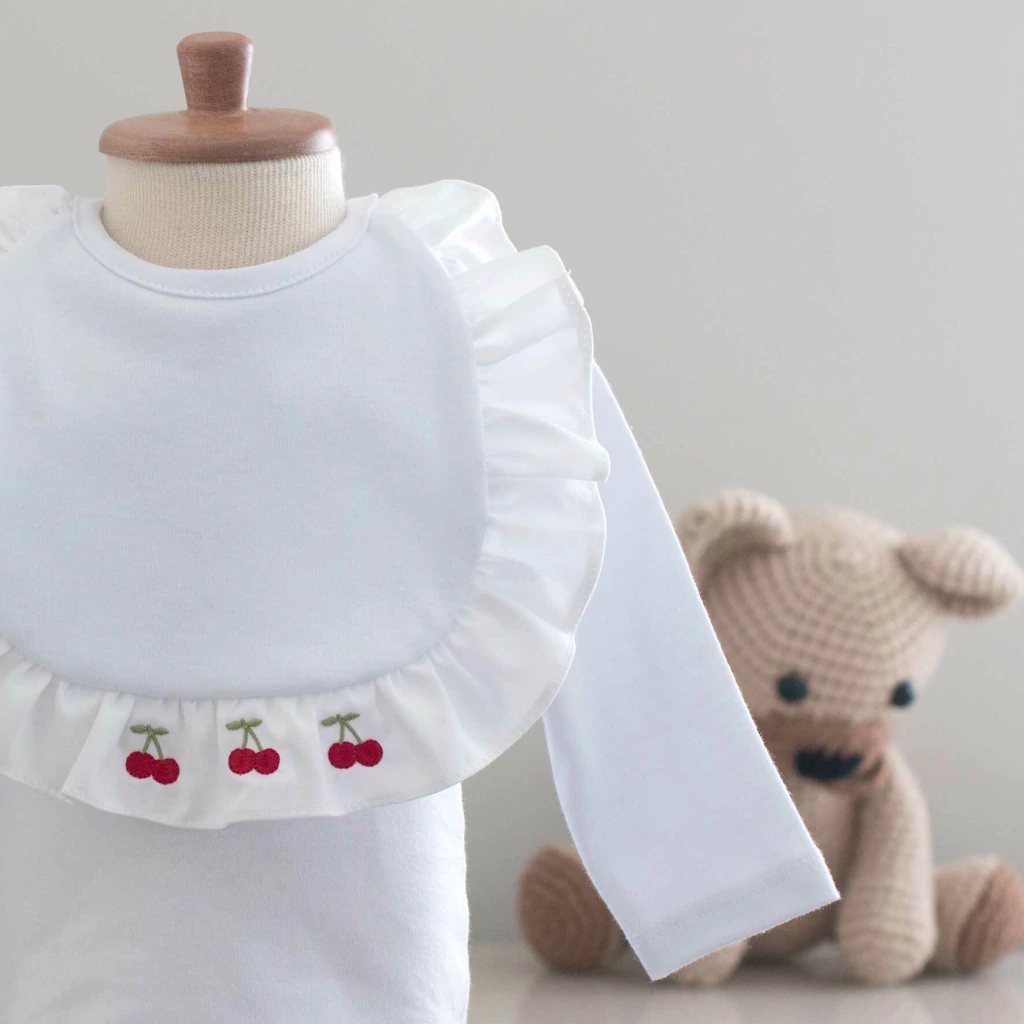 Babador com babadinho em tecido percal 300 fios e lindo bordado de cerejinha, confeccionado em suedine duplo, com toque muito macio e suave. Ideal para o dia a dia para proteger a roupinha do bebê e aumentar o nível de fofura!