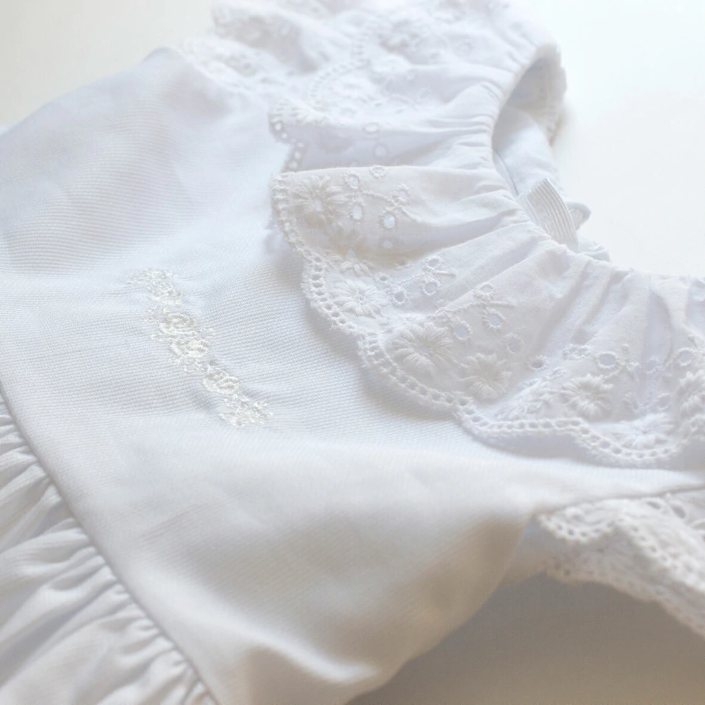 Vestido em tecido fustão 100% algodão com linda gola e manga em bordado inglês 100% algodão. Modelagem clássica e elegante com delicado bordado de flores e lindo laço nas costas. Ideal para batizado e festas.