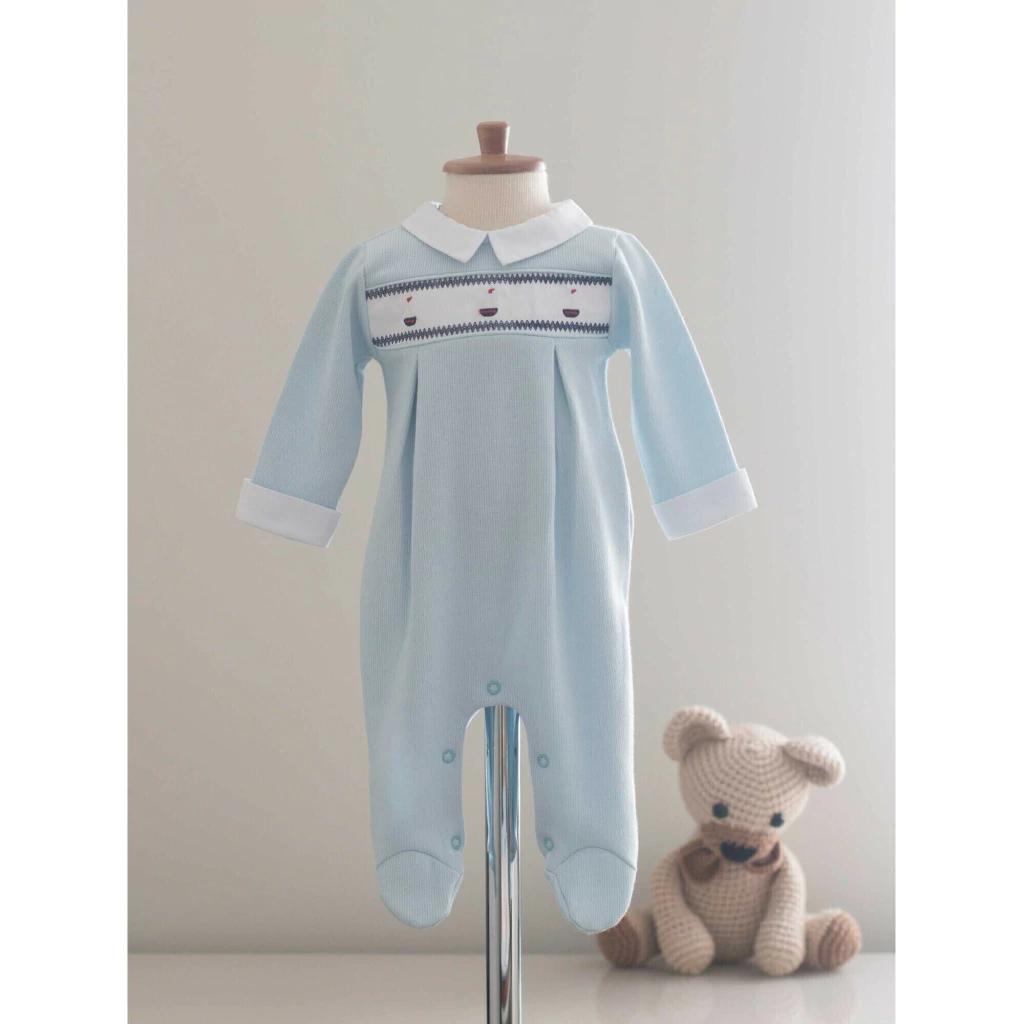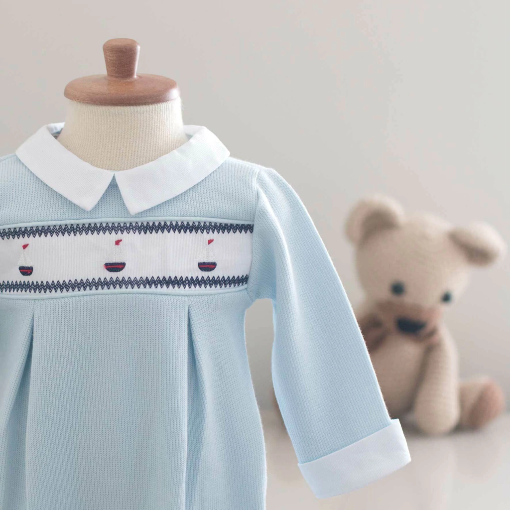 Macacão com aplicação de faixa bordada com barquinhos e pregas para deixar o bebê lindo e confortável. Confeccionado em tricotil, uma malha em algodão antialérgica, que remete ao tricô, proporcionando leveza e suavidade ideal para todas as estações do ano.