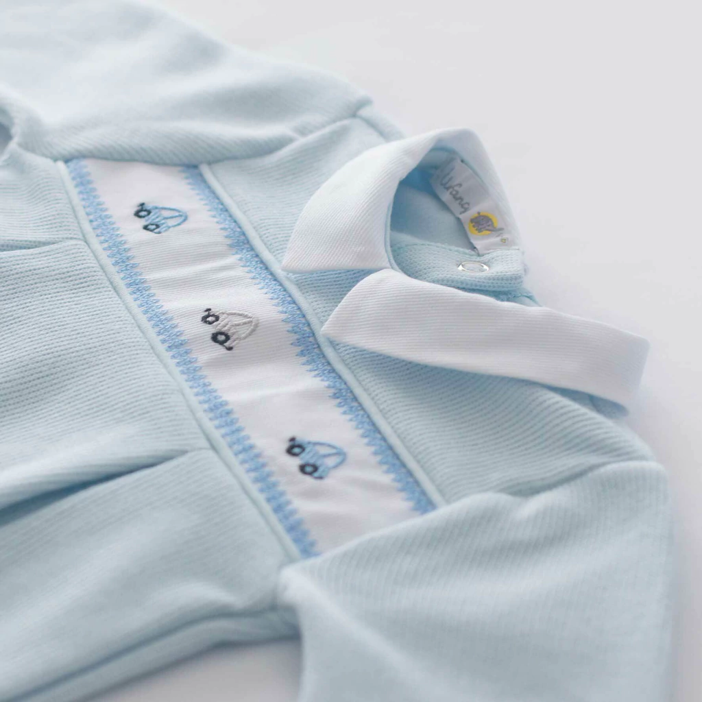 Macacão com aplicação de faixa bordada com carrinhos e pregas para deixar o bebê lindo e confortável. Confeccionado em tricotil, uma malha em algodão antialérgica, que remete ao tricô, proporcionando leveza e suavidade ideal para todas as estações do ano.