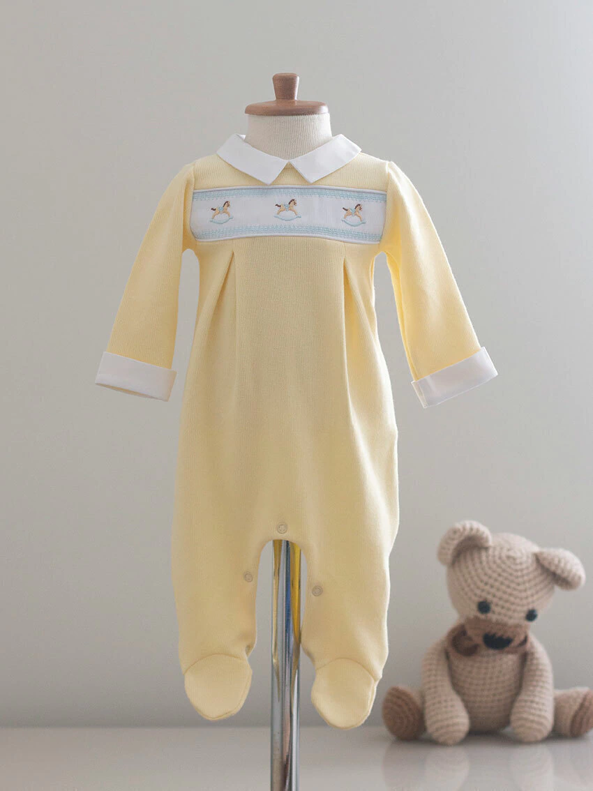 Macacão com aplicação de faixa bordada com cavalinhos e pregas para deixar o bebê lindo e confortável. Confeccionado em tricotil, uma malha em algodão antialérgica, que remete ao tricô, proporcionando leveza e suavidade ideal para todas as estações do ano.