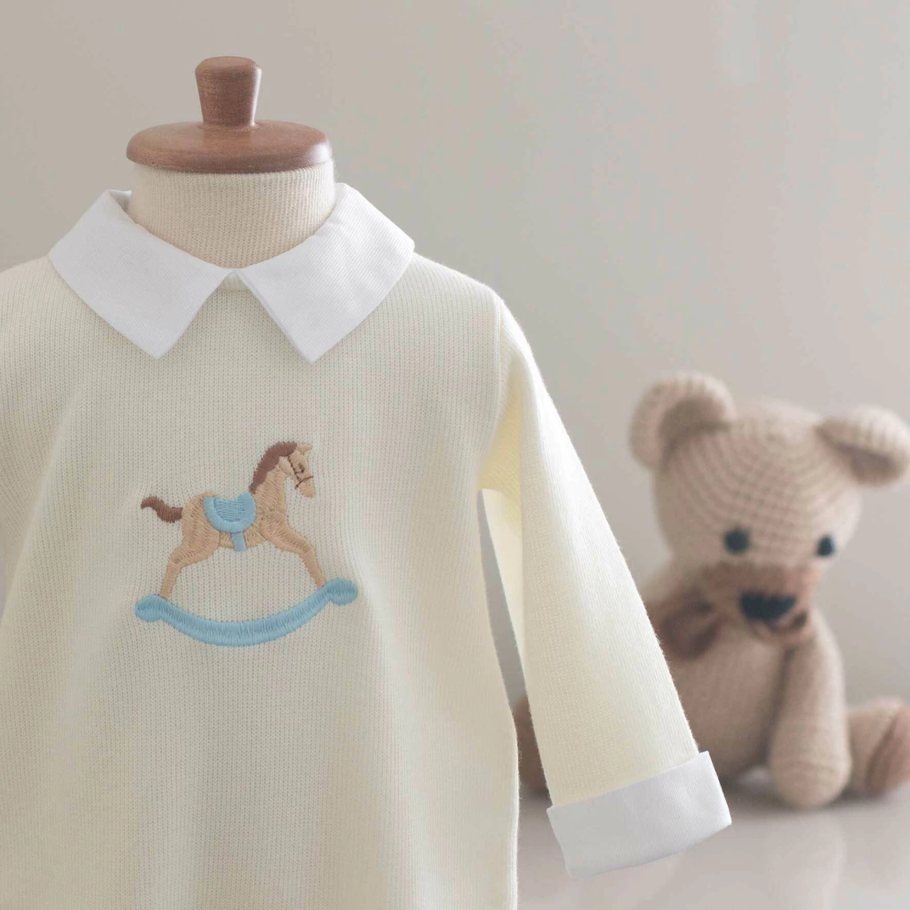 Macacão com modelagem clássica e lindo bordado de cavalinho que proporciona elegância e conforto. Confeccionado em tricotil, uma malha em algodão antialérgica, que remete ao tricô, proporcionando leveza e suavidade ideal para todas as estações do ano.